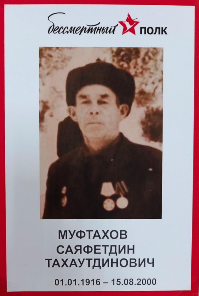Саяфетдин Тахаутдинович Муфтахов – дедушка консультанта Бижбулякского межрайонного суда Розы Кузнецовой. Саяфетдин Муфтахов родился 01 января 1916 года. С 7 лет рос сиротой. Был призван на фронт в 1941 году. Распоряжение командирской части: станция Галенки, село Константиновка. Конная разведка, звание – рядовой. Был талантливым, играл на гармони, поднимал боевой дух товарищей - сослуживцев патриотическими песнями. В бою получил осколочное ранение в голову, был контужен. Награжден Орденом Отечественной войны 1 степени. После демобилизации трудился в колхозе конюхом, был человеком верующим. Саяфетдин Муфтахов умер 15 августа 2000 года.